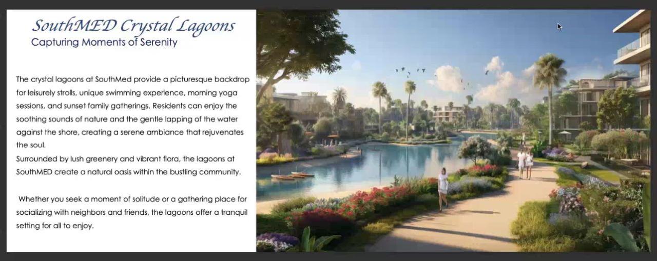 يضم المشروع العديد من الكريستال لاجونز المؤهلة للسباحة، والتي تحتضن المناطق الخضراء في تجربة جديدة من نوعها للسكن والترفيه.