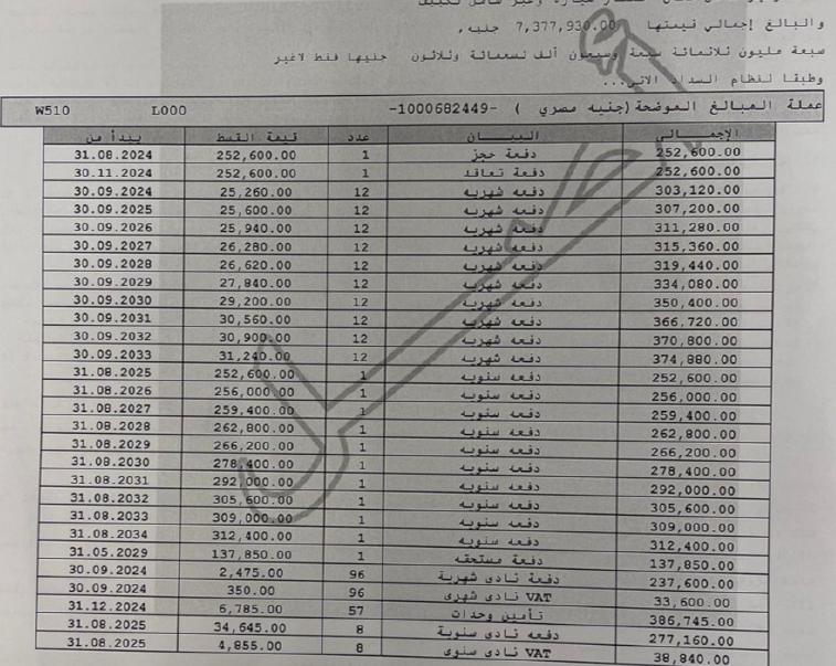 اجمالى السعر على 10 سنوات 7,377,930 شامل النادى