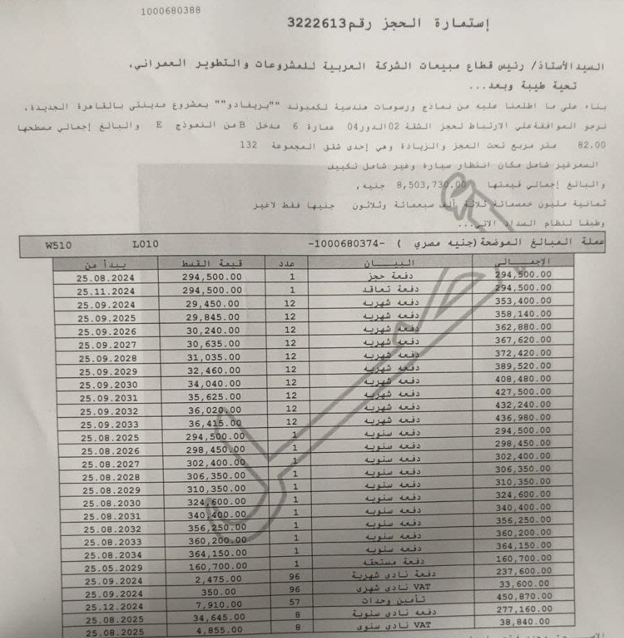 إجمالى ٨ مليون و٥٠٠ الف تقسيط على 10 سنوات