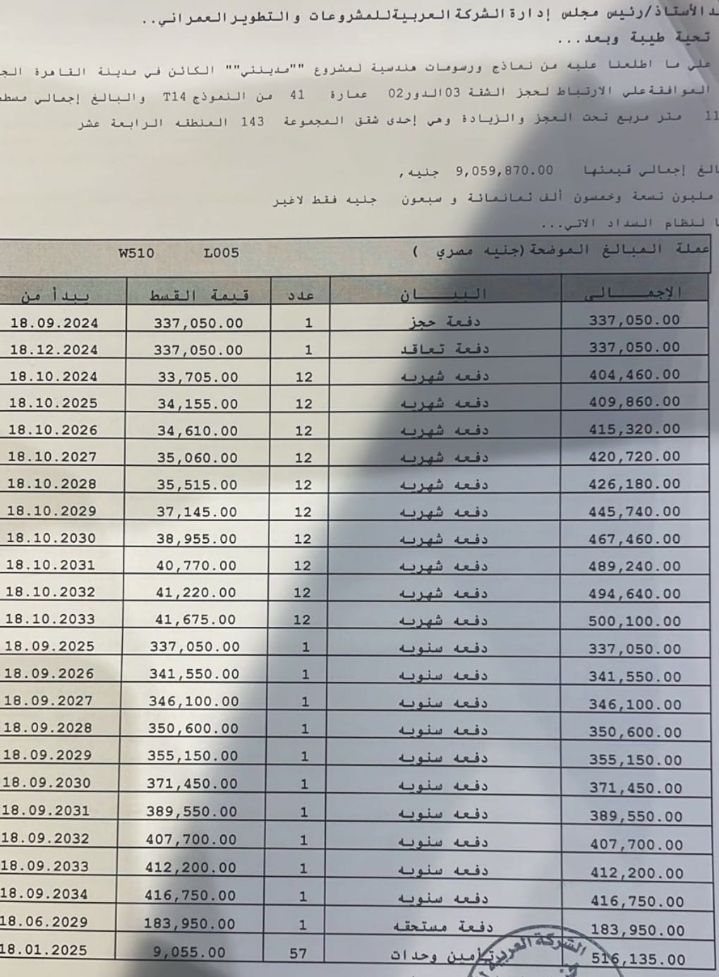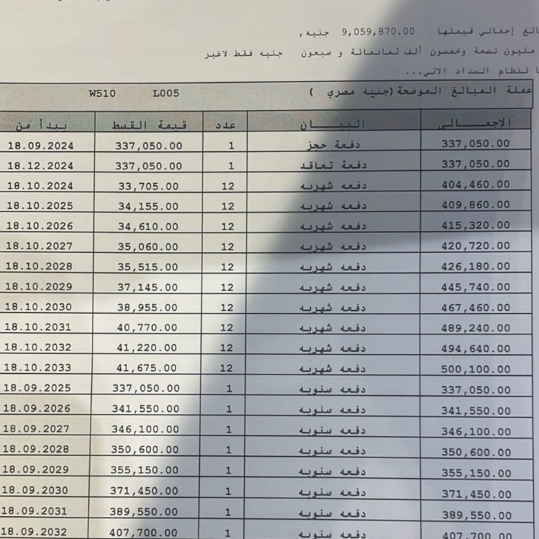 إجمالى العقد 9 مليون تقسيط على 10 سنوات